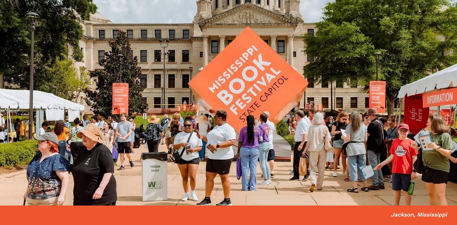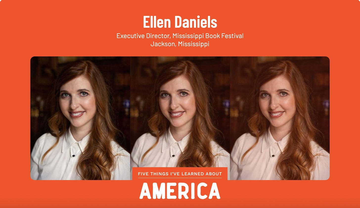Today: A reflection from Jackson, Mississippi’s Ellen Daniels. A life-long Mississippian, Ellen is the Executive Director of the Mississippi Book Festival, the state’s wonderful one-day celebration that unites readers and authors at the Mississippi State Capitol and the nearby Galloway Church. She served as the Festival’s Literary Director from 2019 to 2021, before being appointed Executive Director In September 2021.