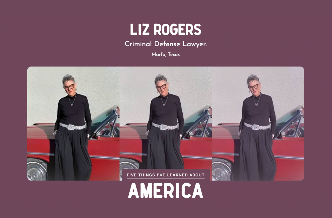 Today: A reflection from Marfa, Texas’ Liz Rogers. Raised on a sheep and goat ranch in Uvalde, Texas, Liz grew up to be one of the most heralded – and most effective - criminal defense lawyers in the state.